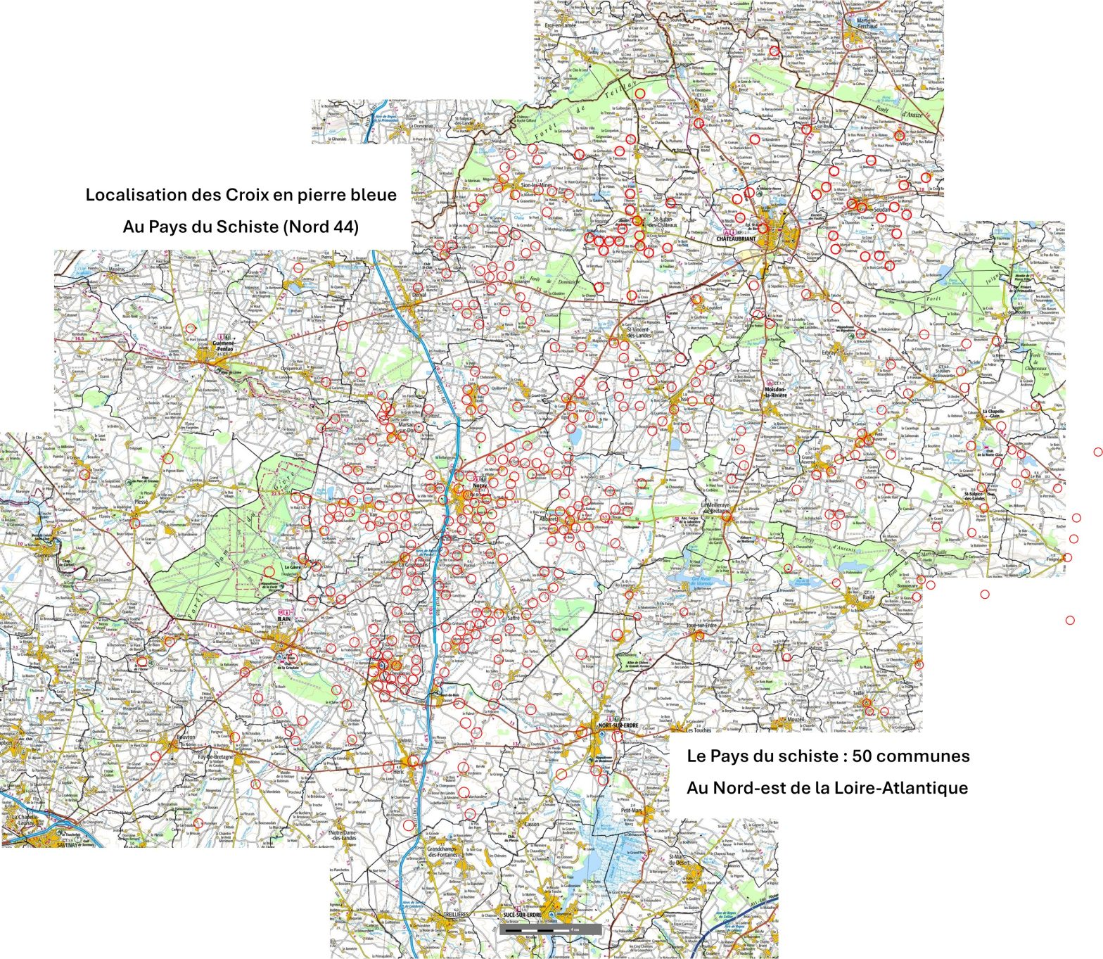 Localisation des croix en pierre bleue avec ou sans christ (en schiste de Nozay) au nord de la Loire-Atlantique, dans le Pays du schiste, autour d’une soixantaine de communes qu’elles contribuent à unifier.