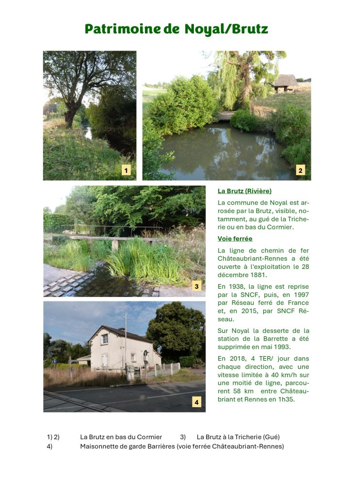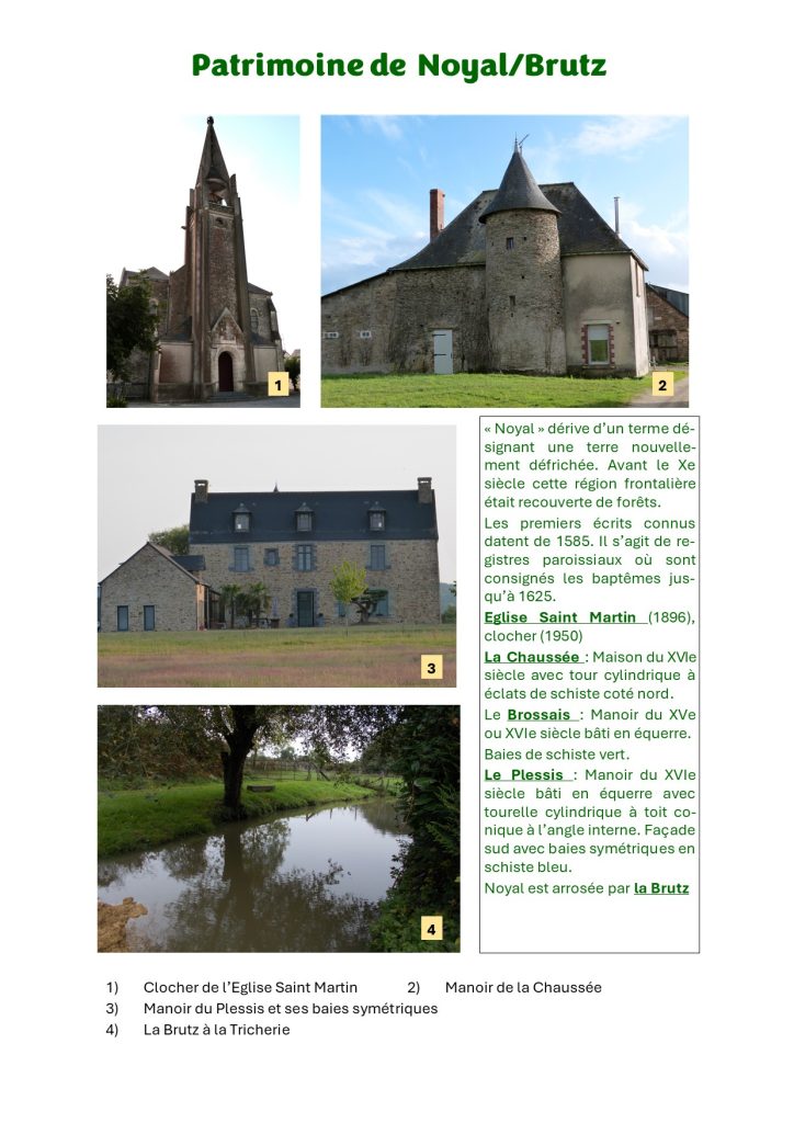 « Noyal/Brutz Patrimoine » présente un aperçu des richesses patrimoniales de la commune de Noyal-sur-Brutz : Châteaux, maisons modernes, manoirs et maisons de caractère, chapelles, édifices religieux, croix, patrimoine de proximité, industrie, carrières, moulins, communications, agriculture, artisanat, topographie, rivières, étangs, bois, flore, mégalithes, archéologie. (Inventaire : Anne Legrais, José Teffo, Didier Teffo).