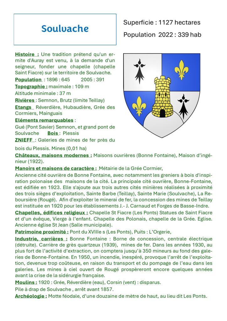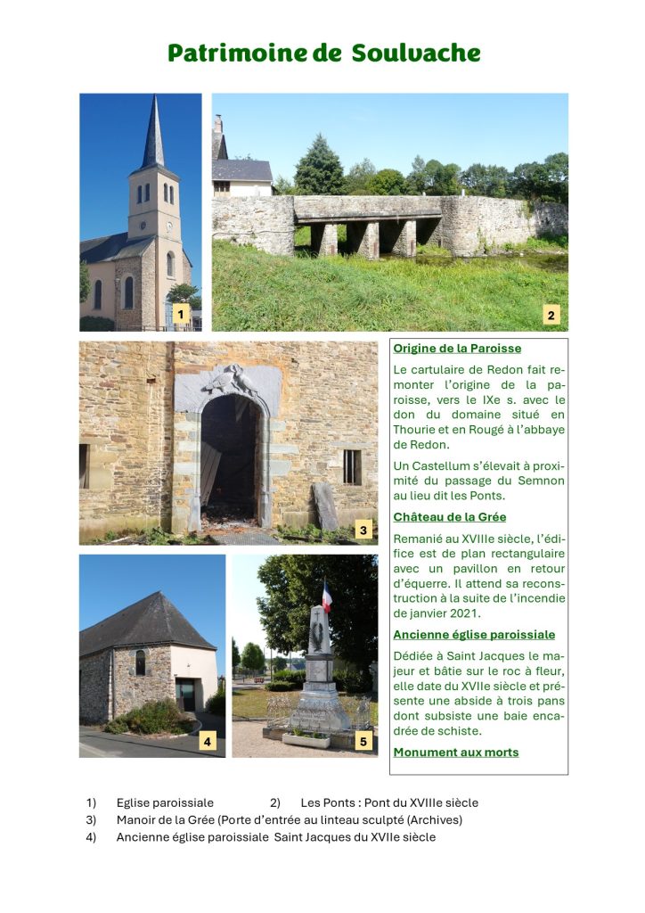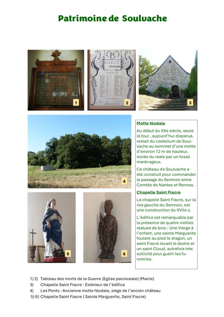 « Soulvache Patrimoine » présente un aperçu des richesses patrimoniales de la commune de Soulvache : Châteaux, maisons modernes, manoirs et maisons de caractère, chapelles, édifices religieux, croix, patrimoine de proximité, industrie, carrières, moulins, communications, agriculture, artisanat, topographie, rivières, étangs, bois, flore, mégalithes, archéologie. (Inventaire : Anne Legrais, José Teffo, Didier Teffo).
