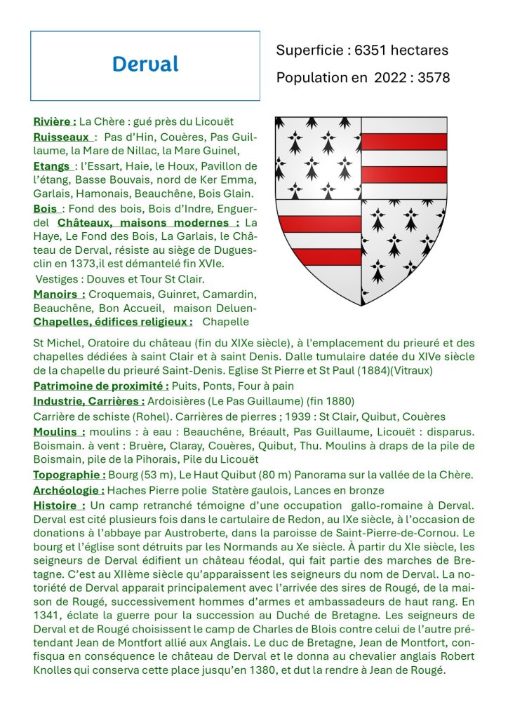 Histoire : Un camp retranché témoigne d’une occupation gallo-romaine à Derval. Derval est cité plusieurs fois dans le cartulaire de Redon, au IXe siècle, à l’occasion de donations à l’abbaye par Austroberte, dans la paroisse de Saint-Pierre-de-Cornou. Le bourg et l’église sont détruits par les Normands au Xe siècle. À partir du XIe siècle, les seigneurs de Derval édifient un château féodal, qui fait partie des marches de Bretagne. C’est au XIIème siècle qu’apparaissent les seigneurs du nom de Derval. La notoriété de Derval apparait principalement avec l’arrivée des sires de Rougé, de la maison de Rougé, successivement hommes d’armes et ambassadeurs de haut rang. En 1341, éclate la guerre pour la succession au Duché de Bretagne. Les seigneurs de Derval et de Rougé choisissent le camp de Charles de Blois contre celui de l’autre prétendant Jean de Montfort allié aux Anglais. Le duc de Bretagne, Jean de Montfort, confisqua en conséquence le château de Derval et le donna au chevalier anglais Robert Knolles qui conserva cette place jusqu’en 1380, et dut la rendre à Jean de Rougé.