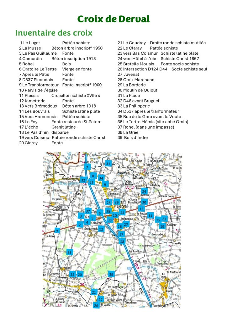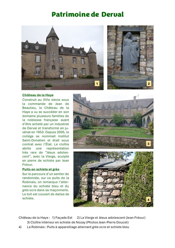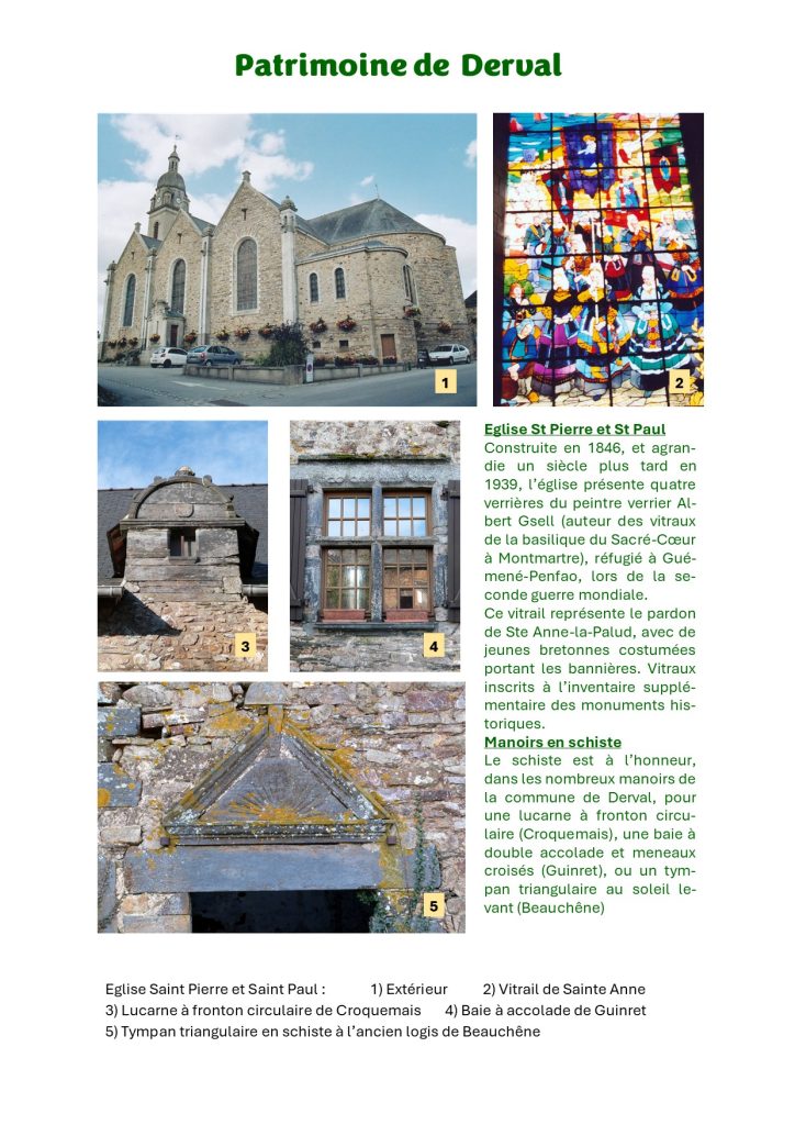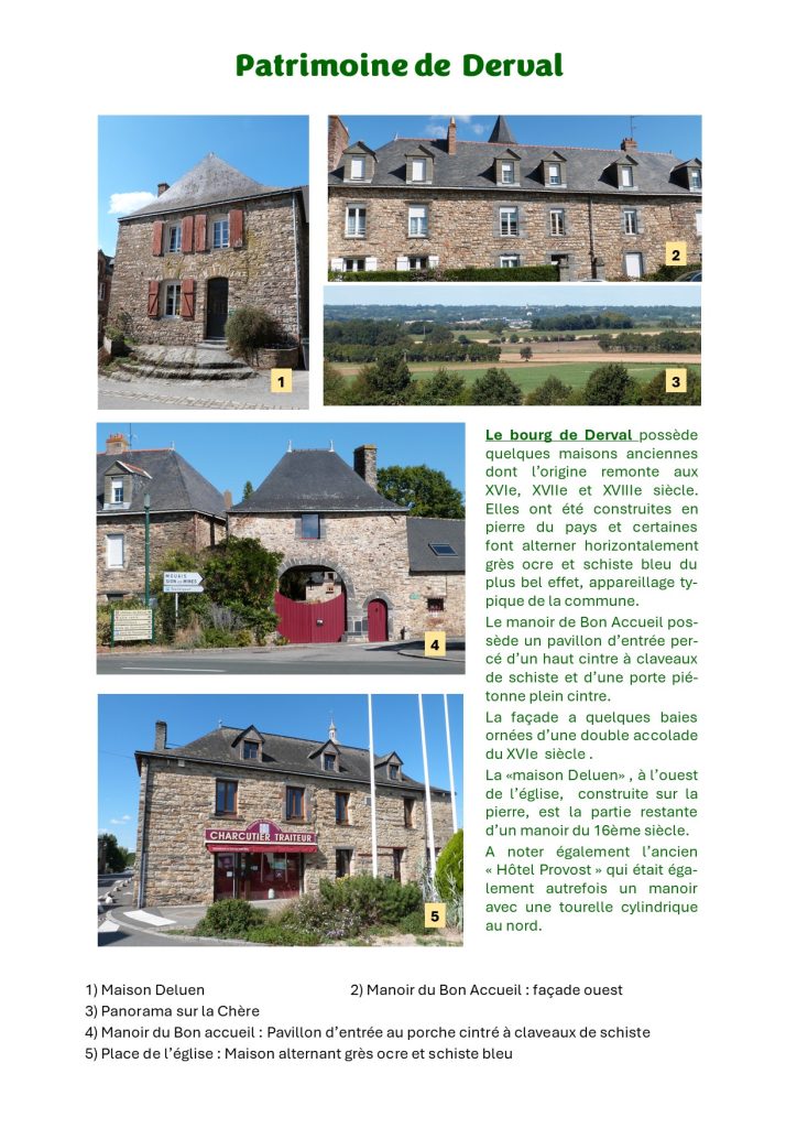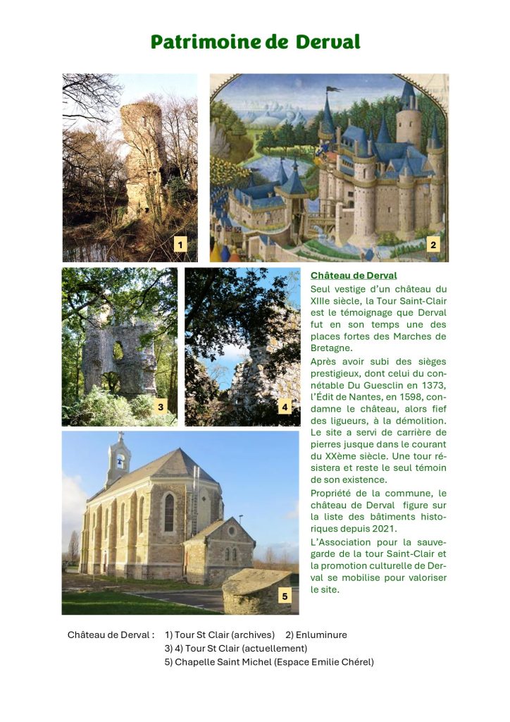« Derval Patrimoine » présente un aperçu des richesses patrimoniales de la commune de Derval : Châteaux, maisons modernes, manoirs et maisons de caractère, chapelles, édifices religieux, croix, patrimoine de proximité, industrie, carrières, moulins, communications, agriculture, artisanat, topographie, rivières, étangs, bois, flore, mégalithes, archéologie. (Inventaire : Anne Legrais, José Teffo, Didier Teffo).
