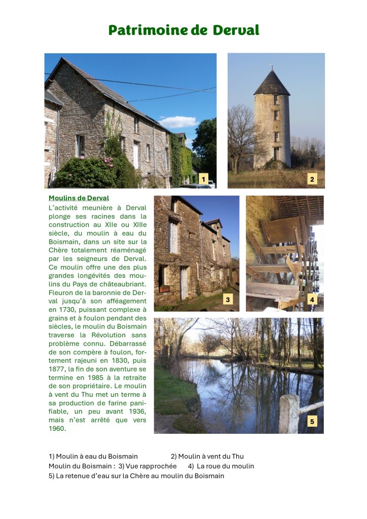 L’activité meunière à Derval plonge ses racines dans la construction au XIIe ou XIIIe siècle, du moulin à eau du Boismain, dans un site sur la Chère totalement réaménagé par les seigneurs de Derval. Ce moulin offre une des plus grandes longévités des moulins du Pays de châteaubriant. Fleuron de la baronnie de Derval jusqu’à son afféagement en 1730, puissant complexe à grains et à foulon pendant des siècles, le moulin du Boismain traverse la Révolution sans problème connu. Débarrassé de son compère à foulon, fortement rajeuni en 1830, puis 1877, la fin de son aventure se termine en 1985 à la retraite de son propriétaire. Le moulin à vent du Thu met un terme à sa production de farine panifiable, un peu avant 1936, mais n’est arrêté que vers 1960.
