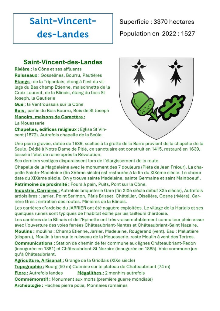 « Saint-Vincent-des-Landes Patrimoine » présente un aperçu des richesses patrimoniales de la commune de Saint-Vincent-des-Landes : Châteaux, maisons modernes, manoirs et maisons de caractère, chapelles, édifices religieux, croix, patrimoine de proximité, industrie, carrières, moulins, communications, agriculture, artisanat, topographie, rivières, étangs, bois, flore, mégalithes, archéologie. (Inventaire : Anne Legrais, José Teffo, Didier Teffo).