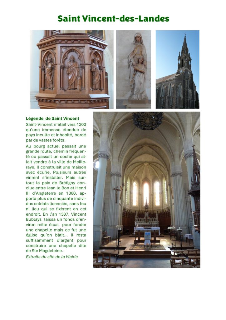 Au bourg actuel passait une grande route, chemin fréquenté où passait un coche qui allait vendre à la ville de Meilleraye. Il construisit une maison avec écurie. Plusieurs autres vinrent s’installer. Mais surtout la paix de Brétigny conclue entre Jean le Bon et Henri III d’Angleterre en 1360, apporta plus de cinquante individus soldats licenciés, sans feu ni lieu qui se fixèrent en cet endroit. En l’an 1387, Vincent Bublays laissa un fonds d’environ mille écus pour fonder une chapelle mais ce fut une église qu’on bâtit… il resta suffisamment d’argent pour construire une chapelle dite de Ste Magdeleine.