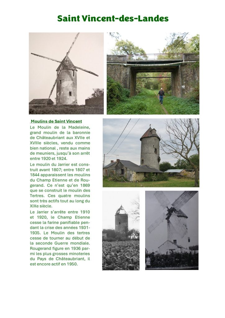 Le Jarrier s’arrête entre 1910 et 1920, le Champ Etienne cesse la farine panifiable pendant la crise des années 1931-1935. Le Moulin des tertres cesse de tourner au début de la seconde Guerre mondiale. Rougerand figure en 1936 parmi les plus grosses minoteries du Pays de Châteaubriant, il est encore actif en 1950.