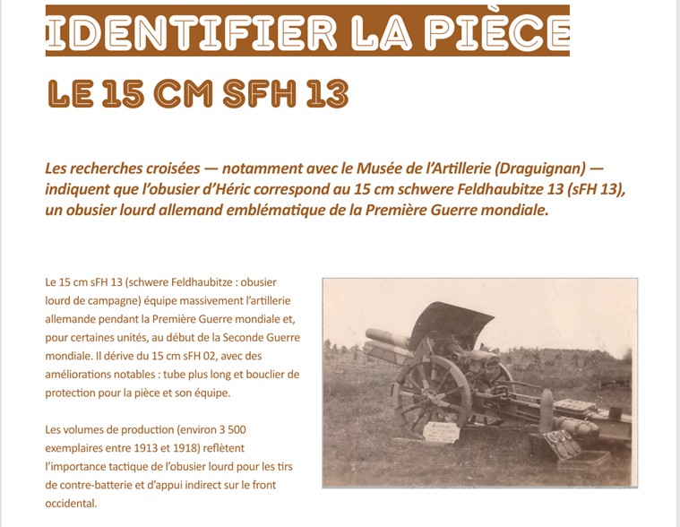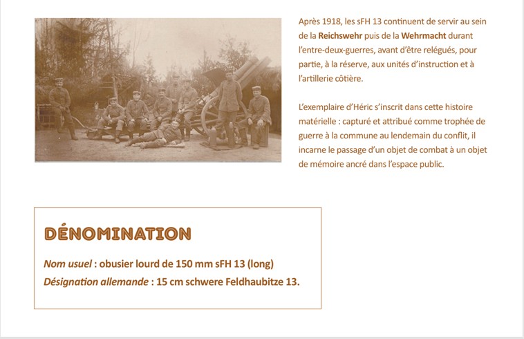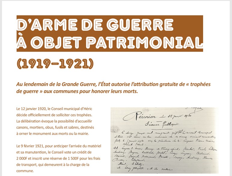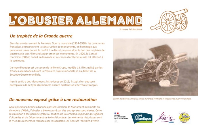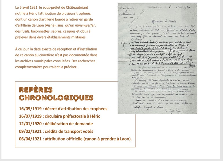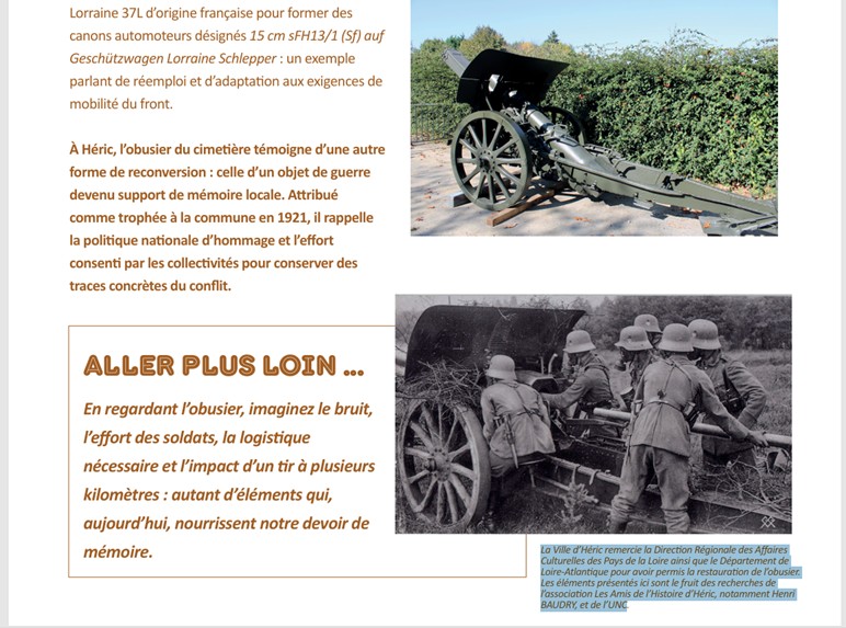 À Héric, l’obusier du cimetière témoigne d’une autre forme de reconversion : celle d’un objet de guerre devenu support de mémoire locale. Attribué comme trophée à la commune en 1921, il rappelle la politique nationale d’hommage et l’effort consenti par les collectivités pour conserver des traces concrètes du conflit.
