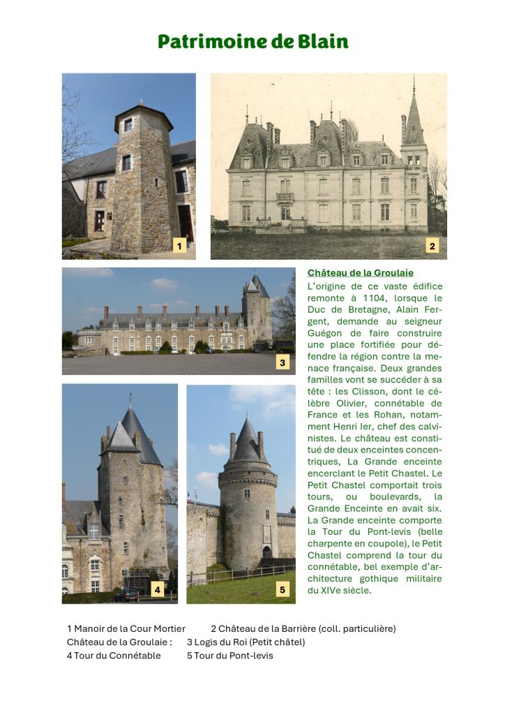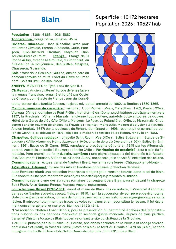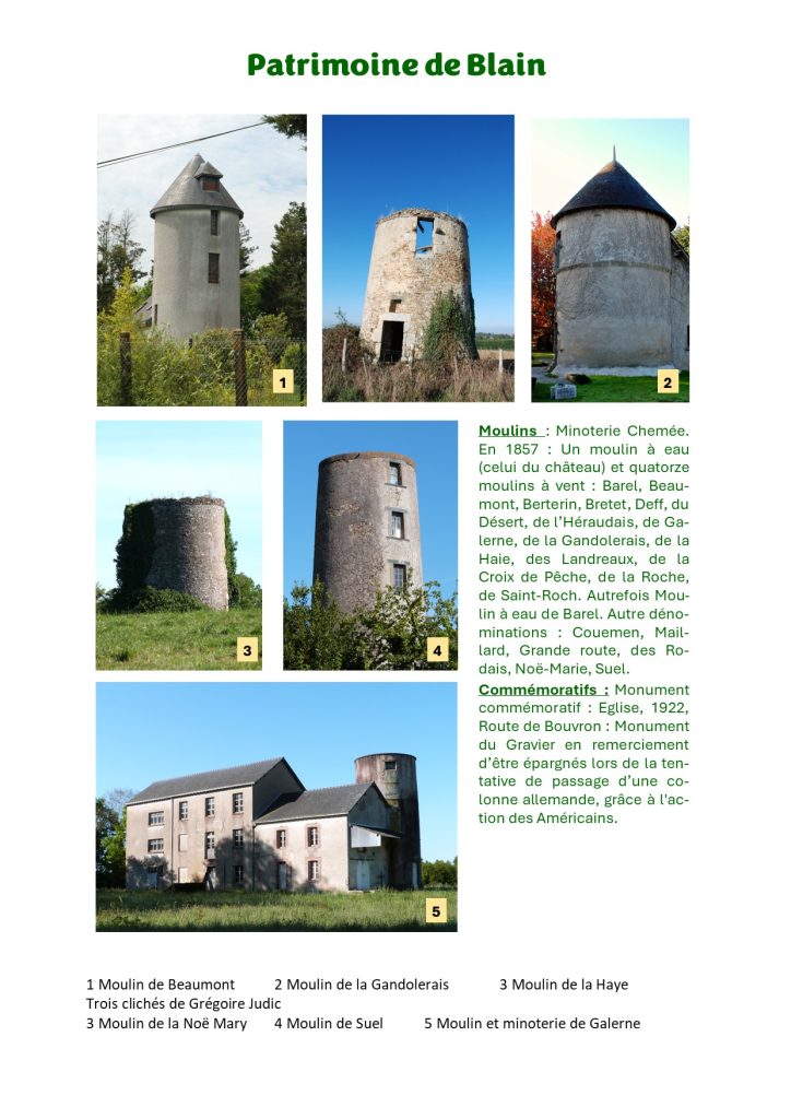« Blain Patrimoine » présente un aperçu des richesses patrimoniales de la commune de Blain sur les thèmes : Châteaux, maisons modernes, manoirs et maisons de caractère, chapelles, édifices religieux, croix, patrimoine de proximité, industrie, carrières, moulins, communications, agriculture, artisanat, topographie, rivières, étangs, bois, flore, mégalithes, archéologie. (Inventaire : Anne Legrais, José Teffo, Didier Teffo, Gilbert Massard).