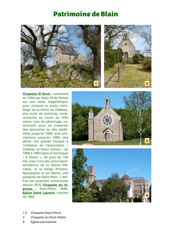 La chapelle St Roch fut construite en 1450 par Alain IX de Rohan sur une butte mégalithique, pour conjurer la peste noire qui ravageait la population. Après avoir été le siège de la frairie du château, elle subit de profonds remaniements au cours du XIXe siècle. La chapelle est restée un lieu de pèlerinage, notamment pour se préserver des épizooties ou des épidémies, jusqu’en 1969, avec processions jusqu’en 1966. Elle abrite une grande fresque réalisée à l’initiative de l’association « Château et Essor blinois » de 1990 à 1993 dans la technique « a fresco ». C’est une œuvre de plus de 100 m2, avec l’une des rares représentations de la Danse Macabre, la Vierge Portière, Apocalypse et les Saints, et une parabole de Saint-Marc. L’édifice est la propriété de la commune depuis 1870.