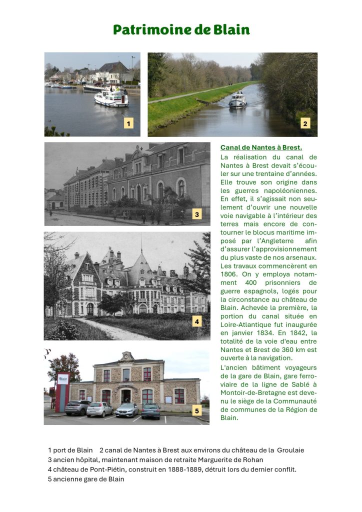 La réalisation du canal de Nantes à Brest devait s’écouler sur une trentaine d’années. Elle trouve son origine dans les guerres napoléoniennes. En effet, il s’agissait non seulement d’ouvrir une nouvelle voie navigable à l’intérieur des terres mais encore de contourner le blocus maritime imposé par l’Angleterre afin d’assurer l’approvisionnement du plus vaste de nos arsenaux. Les travaux commencèrent en 1806. On y employa notamment 400 prisonniers de guerre espagnols, logés pour la circonstance au château de Blain. Achevée la première, la portion du canal située en Loire-Atlantique fut inaugurée en janvier 1834. En 1842, la totalité de la voie d’eau entre Nantes et Brest de 360 km est ouverte à la navigation.