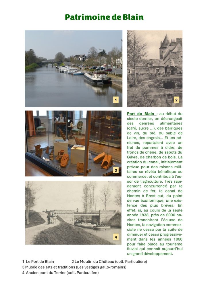 Port de Blain : au début du siècle dernier, on déchargeait des denrées alimentaires (café, sucre …), des barriques de vin, du blé, du sable de Loire, des engrais… Et les péniches, repartaient avec un fret de pommes à cidre, de troncs de chêne, de sabots du Gâvre, de charbon de bois. La création du canal, initialement prévue pour des raisons militaires se révéla bénéfique au commerce, et contribua à l’essor de l’agriculture. Très rapidement concurrencé par le chemin de fer, le canal de Nantes à Brest eut, du point de vue économique, une existence des plus brèves. En effet, si, au cours de la seule année 1838, près de 6000 navires franchirent l’écluse de Nantes, la navigation commerciale ne cessa par la suite de diminuer et cessa progressivement dans les années 1960 pour faire place au tourisme fluvial qui connaît aujourd’hui un grand développement.