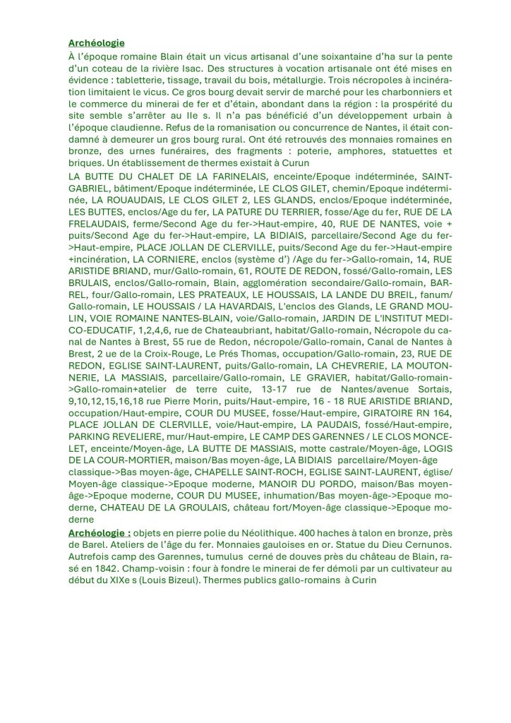 LA BUTTE DU CHALET DE LA FARINELAIS, enceinte/Epoque indéterminée, SAINT-GABRIEL, bâtiment/Epoque indéterminée, LE CLOS GILET, chemin/Epoque indéterminée, LA ROUAUDAIS, LE CLOS GILET 2, LES GLANDS, enclos/Epoque indéterminée, LES BUTTES, enclos/Age du fer, LA PATURE DU TERRIER, fosse/Age du fer, RUE DE LA FRELAUDAIS, ferme/Second Age du fer->Haut-empire, 40, RUE DE NANTES, voie + puits/Second Age du fer->Haut-empire, LA BIDIAIS, parcellaire/Second Age du fer->Haut-empire, PLACE JOLLAN DE CLERVILLE, puits/Second Age du fer->Haut-empire +incinération, LA CORNIERE, enclos (système d’) /Age du fer->Gallo-romain, 14, RUE ARISTIDE BRIAND, mur/Gallo-romain, 61, ROUTE DE REDON, fossé/Gallo-romain, LES BRULAIS, enclos/Gallo-romain, Blain, agglomération secondaire/Gallo-romain, BARREL, four/Gallo-romain, LES PRATEAUX, LE HOUSSAIS, LA LANDE DU BREIL, fanum/Gallo-romain, LE HOUSSAIS / LA HAVARDAIS, L’enclos des Glands, LE GRAND MOULIN, VOIE ROMAINE NANTES-BLAIN, voie/Gallo-romain, JARDIN DE L’INSTITUT MEDICO-EDUCATIF, 1,2,4,6, rue de Chateaubriant, habitat/Gallo-romain, Nécropole du canal de Nantes à Brest, 55 rue de Redon, nécropole/Gallo-romain, Canal de Nantes à Brest, 2 ue de la Croix-Rouge, Le Prés Thomas, occupation/Gallo-romain, 23, RUE DE REDON, EGLISE SAINT-LAURENT, puits/Gallo-romain, LA CHEVRERIE, LA MOUTONNERIE, LA MASSIAIS, parcellaire/Gallo-romain, LE GRAVIER, habitat/Gallo-romain->Gallo-romain+atelier de terre cuite, 13-17 rue de Nantes/avenue Sortais, 9,10,12,15,16,18 rue Pierre Morin, puits/Haut-empire, 16 – 18 RUE ARISTIDE BRIAND, occupation/Haut-empire, COUR DU MUSEE, fosse/Haut-empire, GIRATOIRE RN 164, PLACE JOLLAN DE CLERVILLE, voie/Haut-empire, LA PAUDAIS, fossé/Haut-empire, PARKING REVELIERE, mur/Haut-empire, LE CAMP DES GARENNES / LE CLOS MONCELET, enceinte/Moyen-âge, LA BUTTE DE MASSIAIS, motte castrale/Moyen-âge, LOGIS DE LA COUR-MORTIER, maison/Bas moyen-âge, LA BIDIAIS parcellaire/Moyen-âge classique->Bas moyen-âge, CHAPELLE SAINT-ROCH, EGLISE SAINT-LAURENT, église/Moyen-âge classique->Epoque moderne, MANOIR DU PORDO, maison/Bas moyen-âge->Epoque moderne, COUR DU MUSEE, inhumation/Bas moyen-âge->Epoque moderne, CHATEAU DE LA GROULAIS, château fort/Moyen-âge classique->Epoque moderne