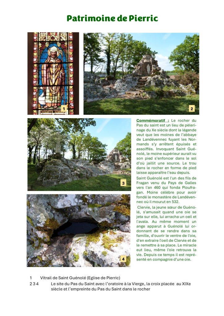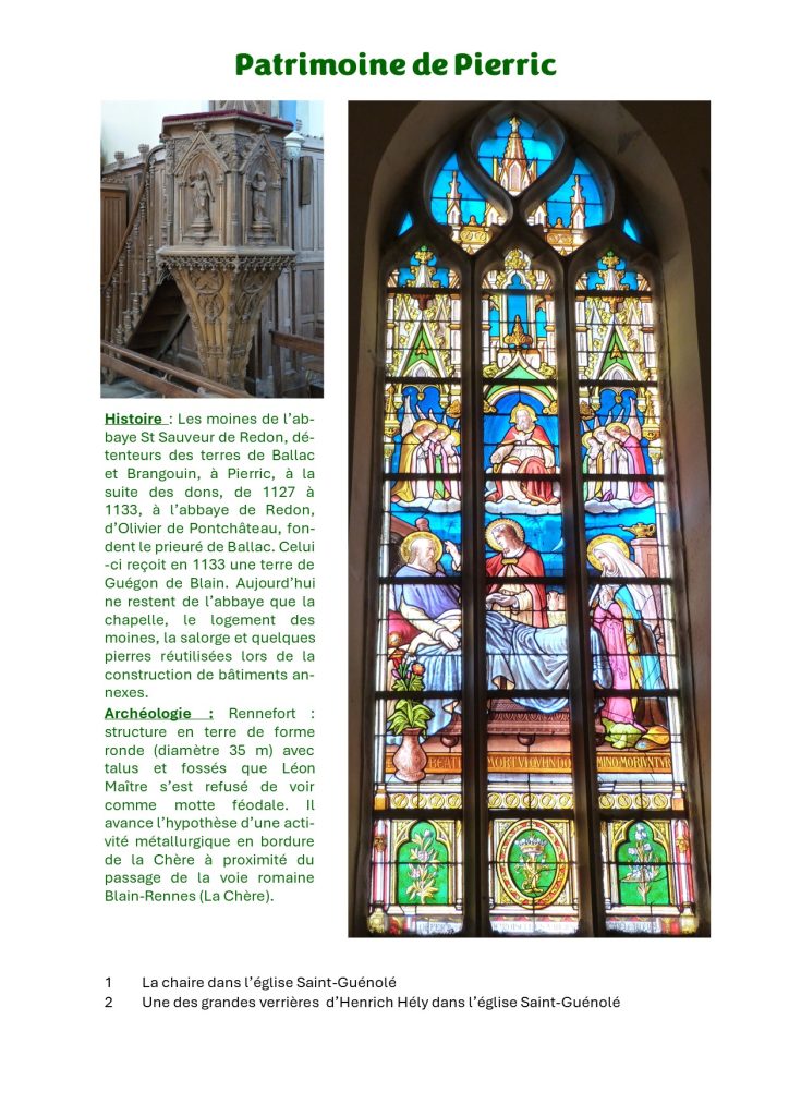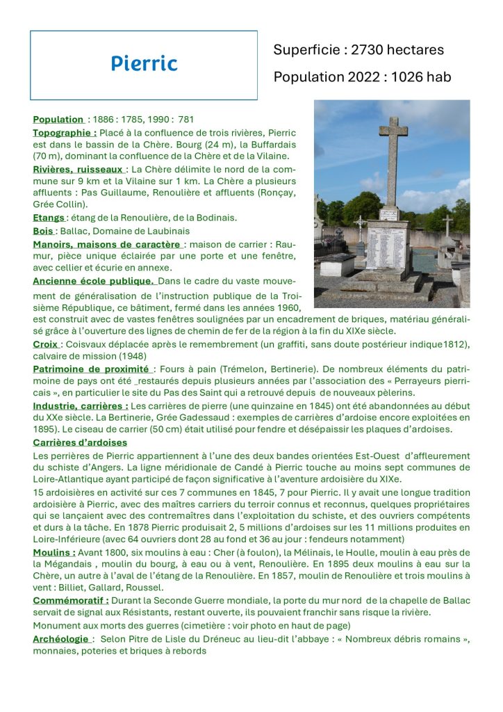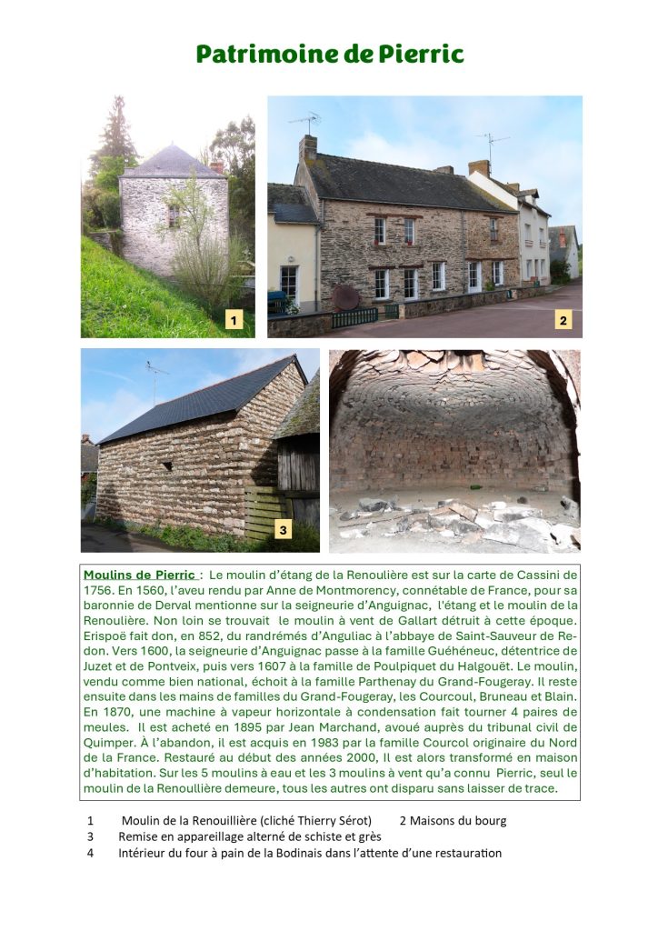 « Pierric Patrimoine » présente un aperçu des richesses patrimoniales de la commune de Pierric sur les thèmes : Châteaux, maisons modernes, manoirs et maisons de caractère, chapelles, édifices religieux, croix, patrimoine de proximité, industrie, carrières, moulins, communications, agriculture, artisanat, topographie, rivières, étangs, bois, flore, mégalithes, archéologie. (Inventaire : Anne Legrais, José Teffo, Didier Teffo, Gilbert Massard).