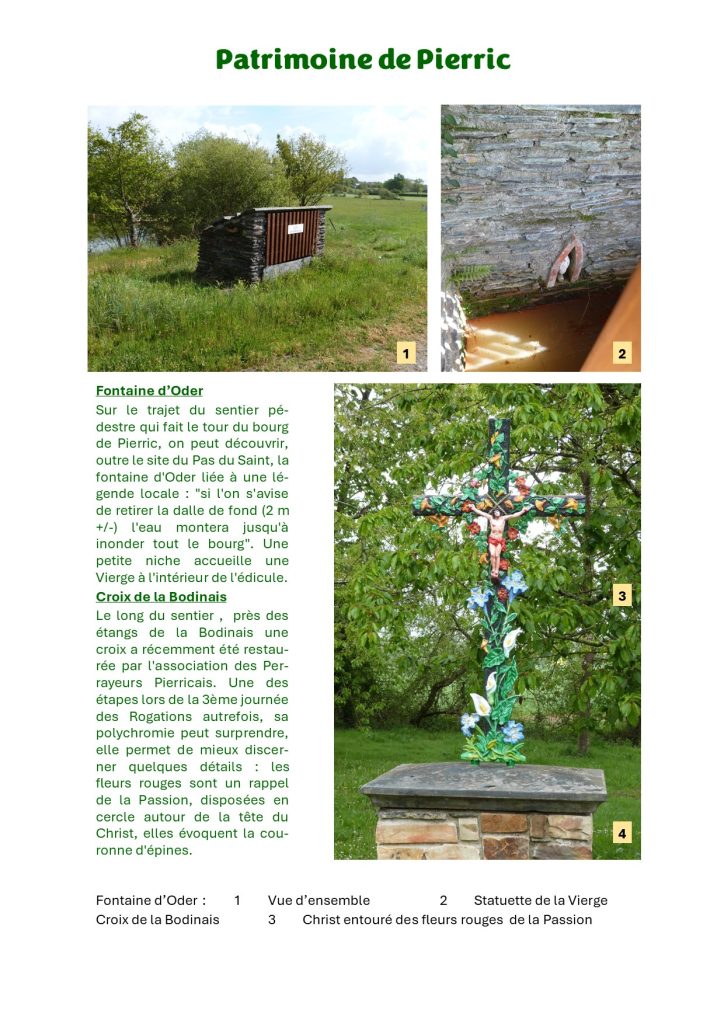 Sur le trajet du sentier pédestre qui fait le tour du bourg de Pierric, on peut découvrir, outre le site du Pas du Saint, la fontaine d’Oder liée à une légende locale : « si l’on s’avise de retirer la dalle de fond (2 m +/-) l’eau montera jusqu’à inonder tout le bourg ». Une petite niche accueille une Vierge à l’intérieur de l’édicule.