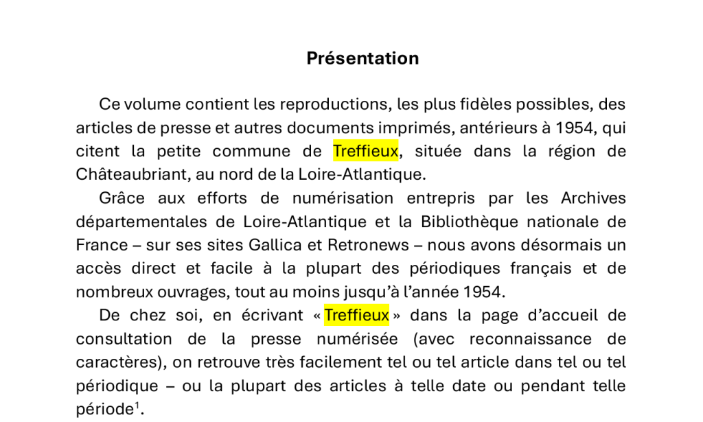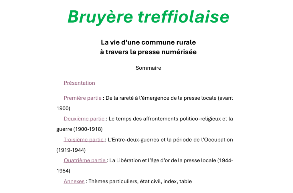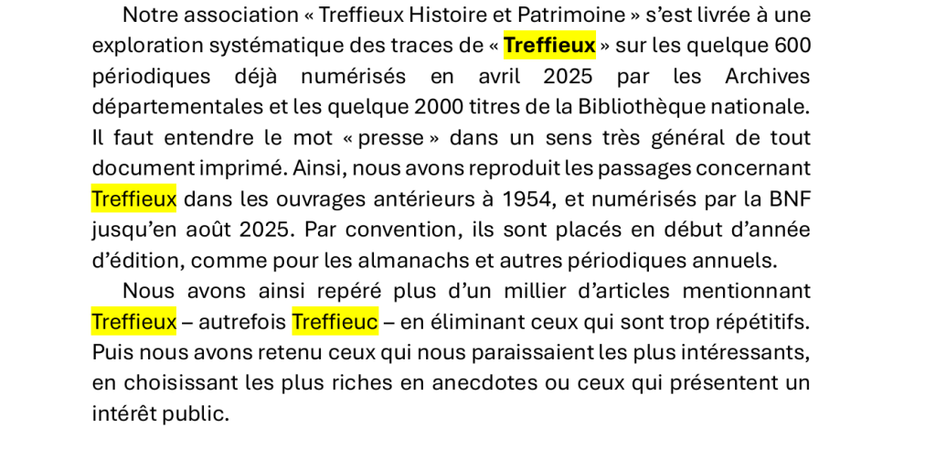 Notre association « Treffieux Histoire et Patrimoine » s’est livrée à une exploration systématique des traces de « Treffieux » sur les quelque 600 périodiques déjà numérisés en avril 2025 par les Archives départementales et les quelque 2000 titres de la Bibliothèque nationale.