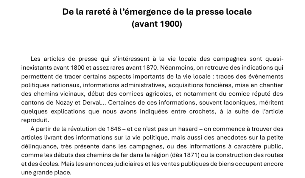Les articles de presse qui s’intéressent à la vie locale des campagnes sont quasi inexistants avant 1800 et assez rares avant 1870. Néanmoins, on retrouve des indications qui permettent de tracer certains aspects importants de la vie locale : traces des événements