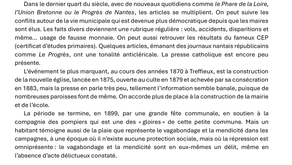 sont élus. Les faits divers deviennent une rubrique régulière : vols, accidents, disparitions et même… usage de fausse monnaie. On peut aussi retrouver les résultats du fameux CEP (certificat d’études primaires). Quelques articles, émanant des journaux nantais républicains comme Le Progrès, ont une tonalité anticléricale. La presse catholique est encore peu présente.
