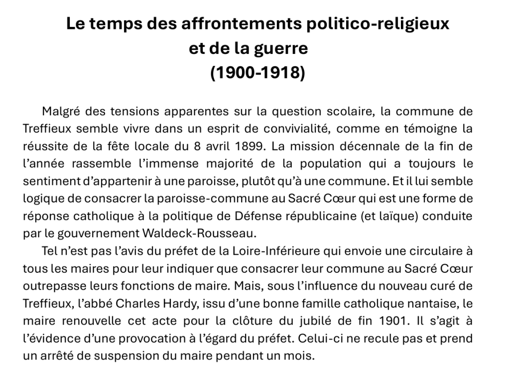 Tel n’est pas l’avis du préfet de la Loire-Inférieure qui envoie une circulaire à tous les maires pour leur indiquer que consacrer leur commune au Sacré Cœur outrepasse leurs fonctions de maire. Mais, sous l’influence du nouveau curé de Treffieux, l’abbé Charles Hardy, issu d’une bonne famille catholique nantaise, le maire renouvelle cet acte pour la clôture du jubilé de fin 1901. Il s’agit à l’évidence d’une provocation à l’égard du préfet. Celui-ci ne recule pas et prend