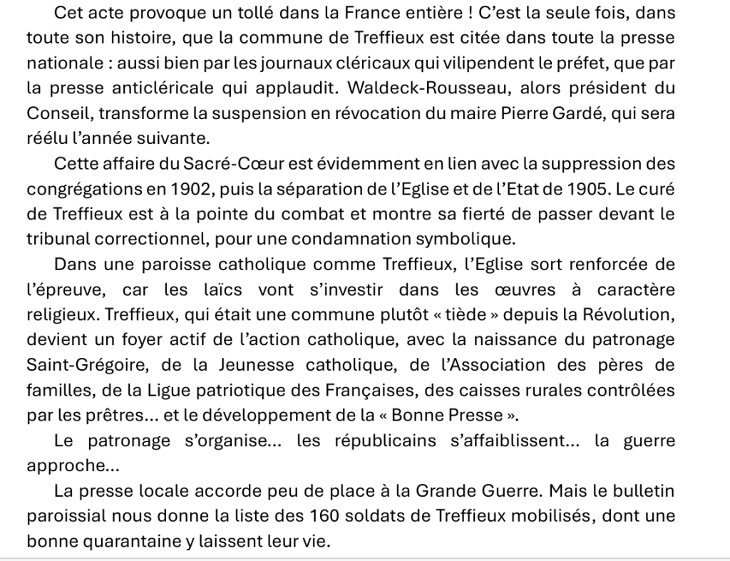 Cette affaire du Sacré-Cœur est évidemment en lien avec la suppression des congrégations en 1902, puis la séparation de l’Eglise et de l’Etat de 1905. Le curé de Treffieux est à la pointe du combat et montre sa fierté de passer devant le tribunal correctionnel, pour une condamnation symbolique.