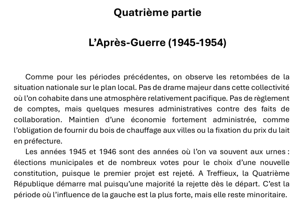 Les années 1945 et 1946 sont des années où l’on va souvent aux urnes : élections municipales et de nombreux votes pour le choix d’une nouvelle constitution, puisque le premier projet est rejeté. A Treffieux, la Quatrième République démarre mal puisqu’une majorité la rejette dès le départ. C’est la période où l’influence de la gauche est la plus forte, mais elle reste minoritaire.