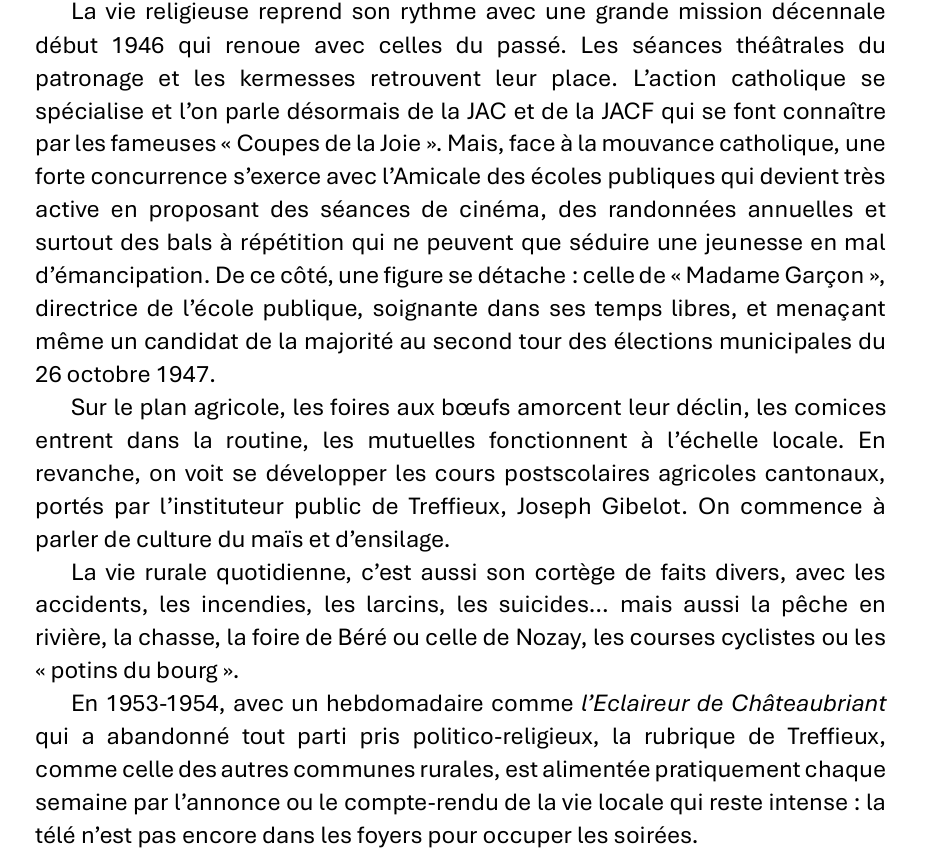 En 1953-1954, avec un hebdomadaire comme l’Eclaireur de Châteaubriant qui a abandonné tout parti pris politico-religieux, la rubrique de Treffieux, comme celle des autres communes rurales, est alimentée pratiquement chaque semaine par l’annonce ou le compte-rendu de la vie locale qui reste intense : la télé n’est pas encore dans les foyers pour occuper les soirées.