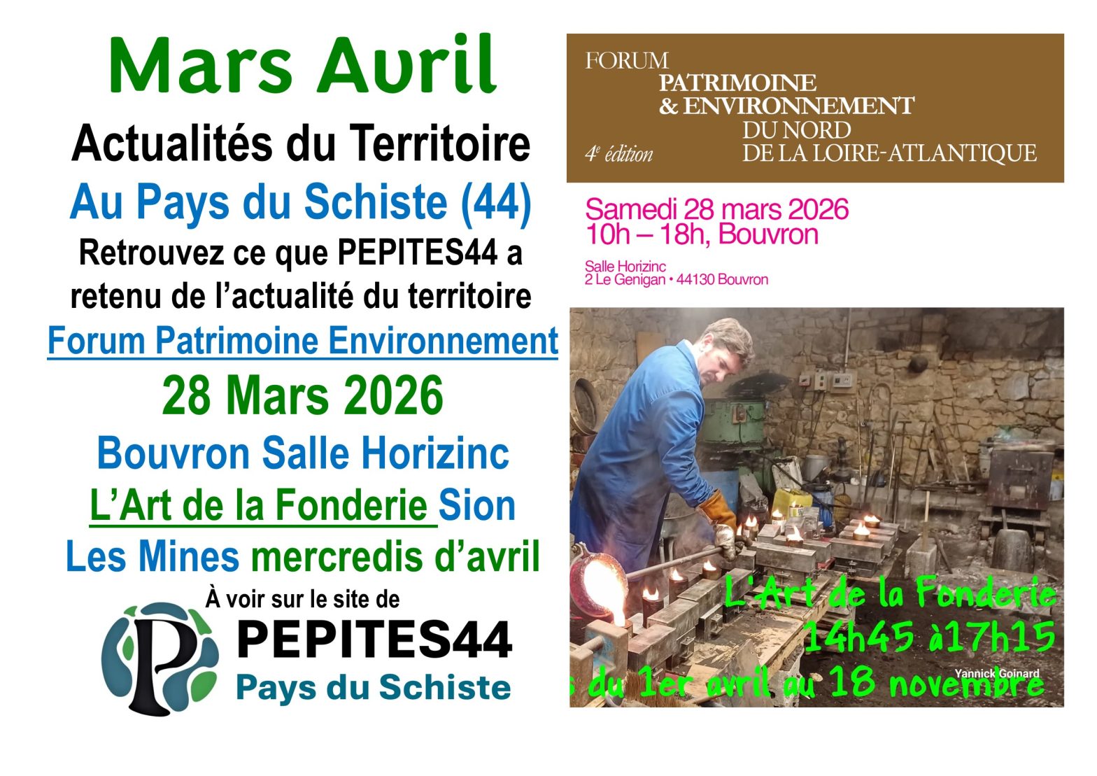 Mars avril 2026, ce que PEPITES44 a retenu de l’actualité du Pays du schiste en Loire-Atlantique : Bouvron le 28 mars 2026, Forum Patrimoine et Environnement à la salle Horizinc de 10H00 à 18H00, Sion-les-Mines, tous les mercredi du mois, aux forges de la Hunaudière, l’art de la Fonderie, de 14H45 à 17H15.