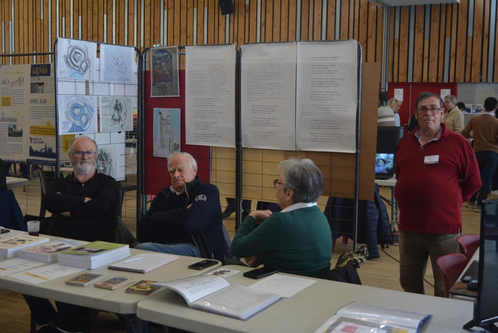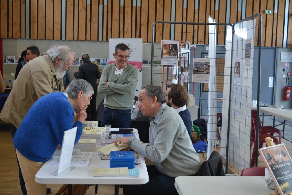 On discute au stand de la Société archéologique et Historique de Nantes et La Loire-Atlantique. On aperçoit à droite la dernière publication de Georges Saffré : « Issé sous l’occupation ».