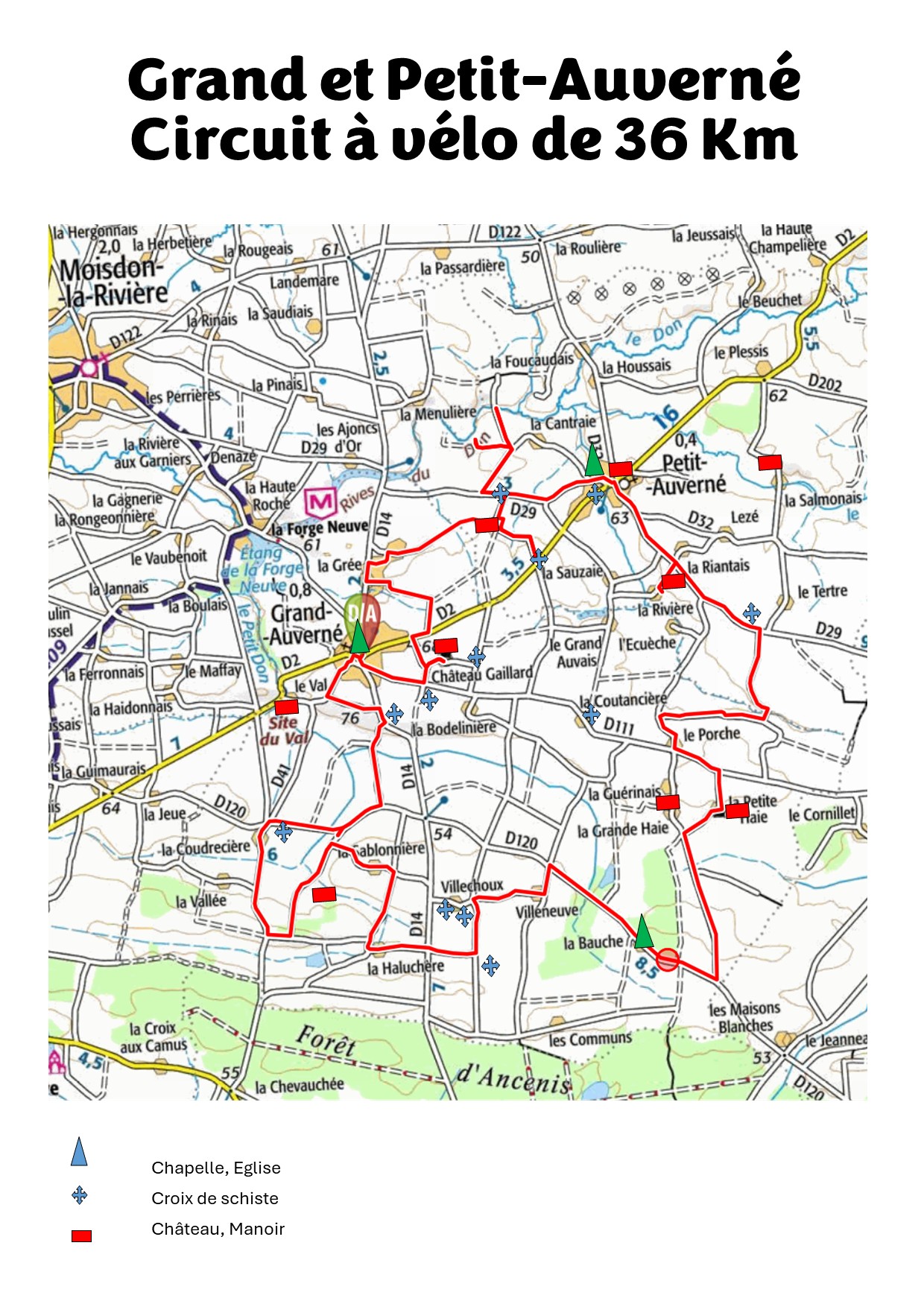 Des circuits à vélo pour découvrir tranquillement le patrimoine du Pays de Châteaubriant-Derval en Loire-Atlantique : première étape : Grand et Petit-Auverné (36 km), Noyal/Brutz-Villepôt (32 km), Derval-Mouais (32 km), bientôt d’autres circuits, à partir du livret « Trésors du Patrimoine du Pays de Châteaubriant et de Derval »