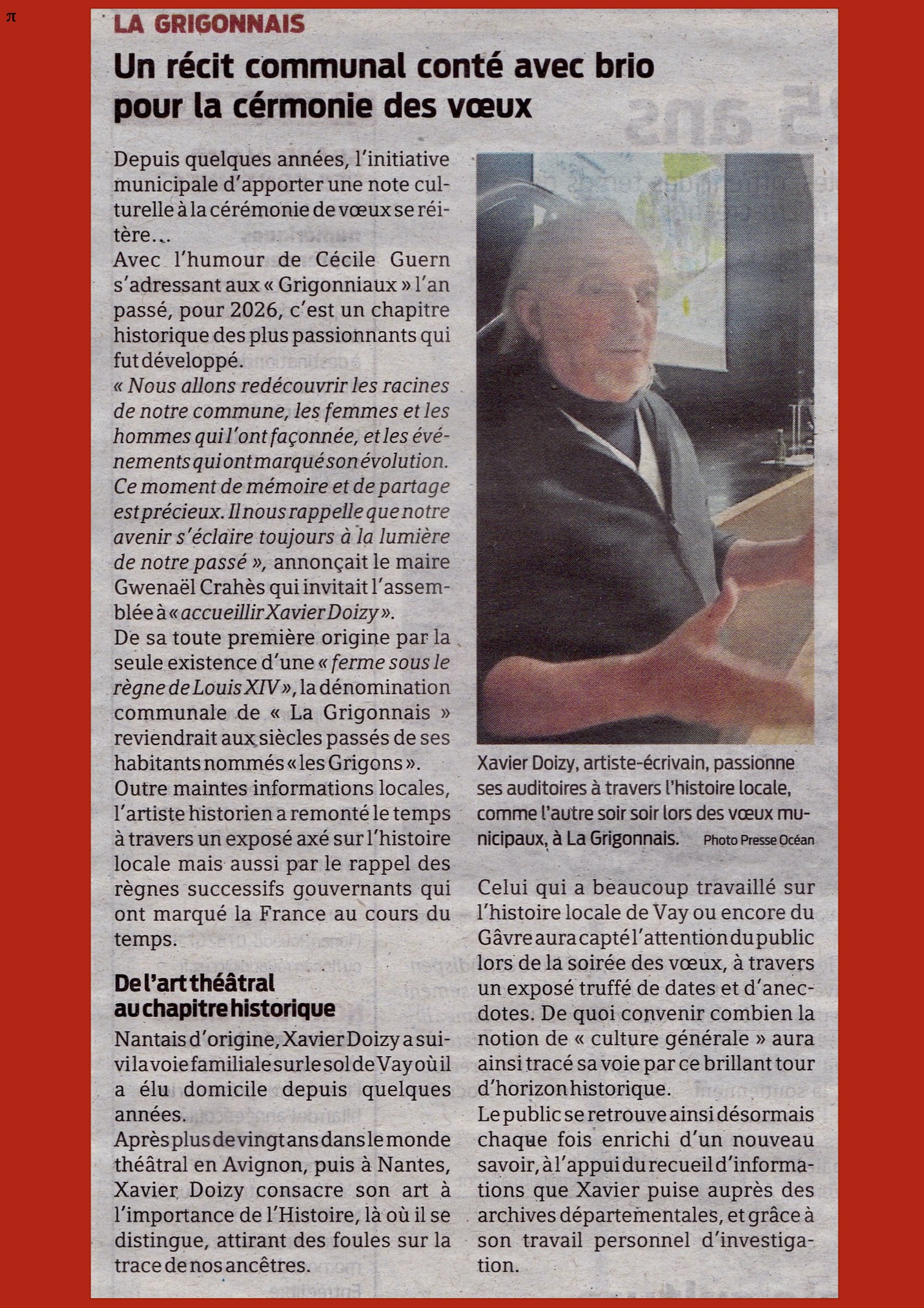 La Grigonnais. Un récit communal conté avec brio pour la cérémonie des vœux. Presse-Océan 2 janvier 2026