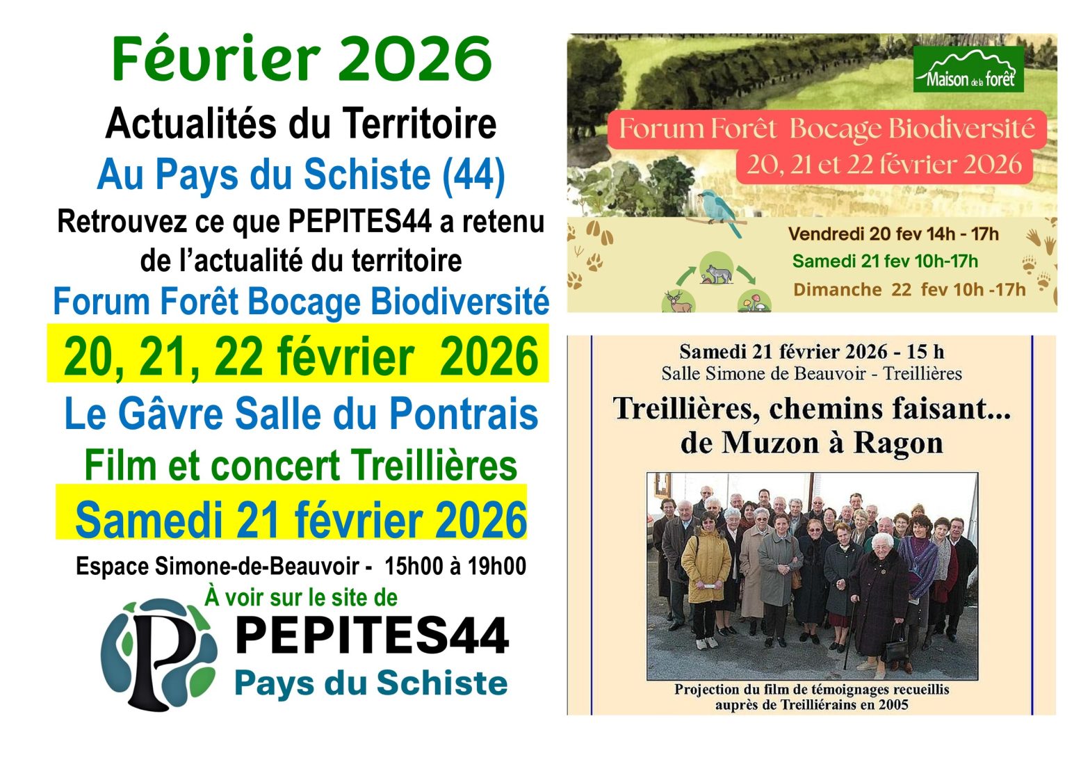 Février 2026 : retrouvez ce que PEPITES44 a retenu de l’actualité du Pays du schiste en Loire-Atlantique : Forum Forêt Bocage Biodiversité, 20, 21, 22 février 2026, Le Gâvre Salle du Pontrais, Film et concert Treillières, Samedi 21 février 2026, Espace Simone-de-Beauvoir – 15h00 à 19h00